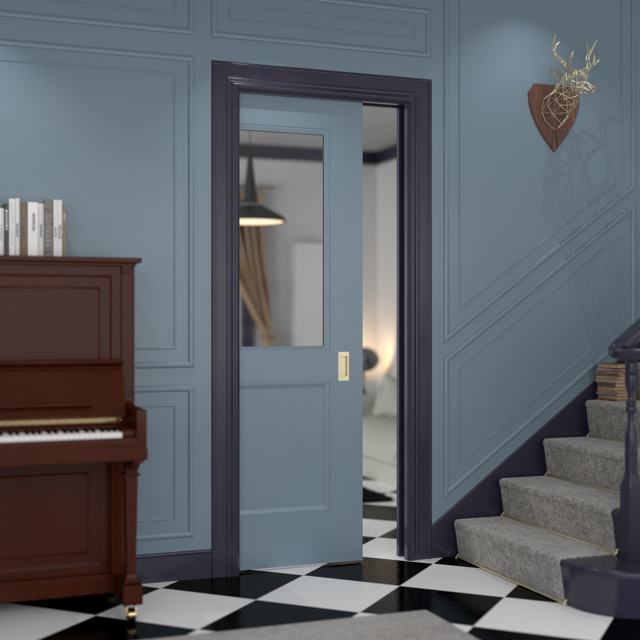Care must be taken when using any door being installed within a pocket where the door includes decorative features in the faces. This is to ensure that those features are central as intended when the door is in the closed position, as some of the door edges are concealed within the frame when the door is closed. In most situations the decorative features will need to be offset slightly to maintain the visual aspect as intended.